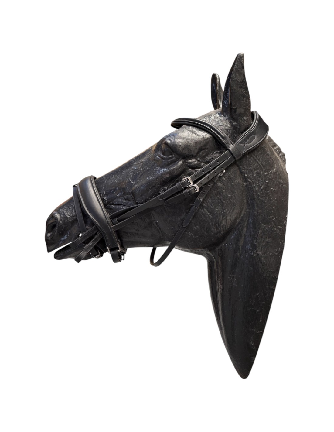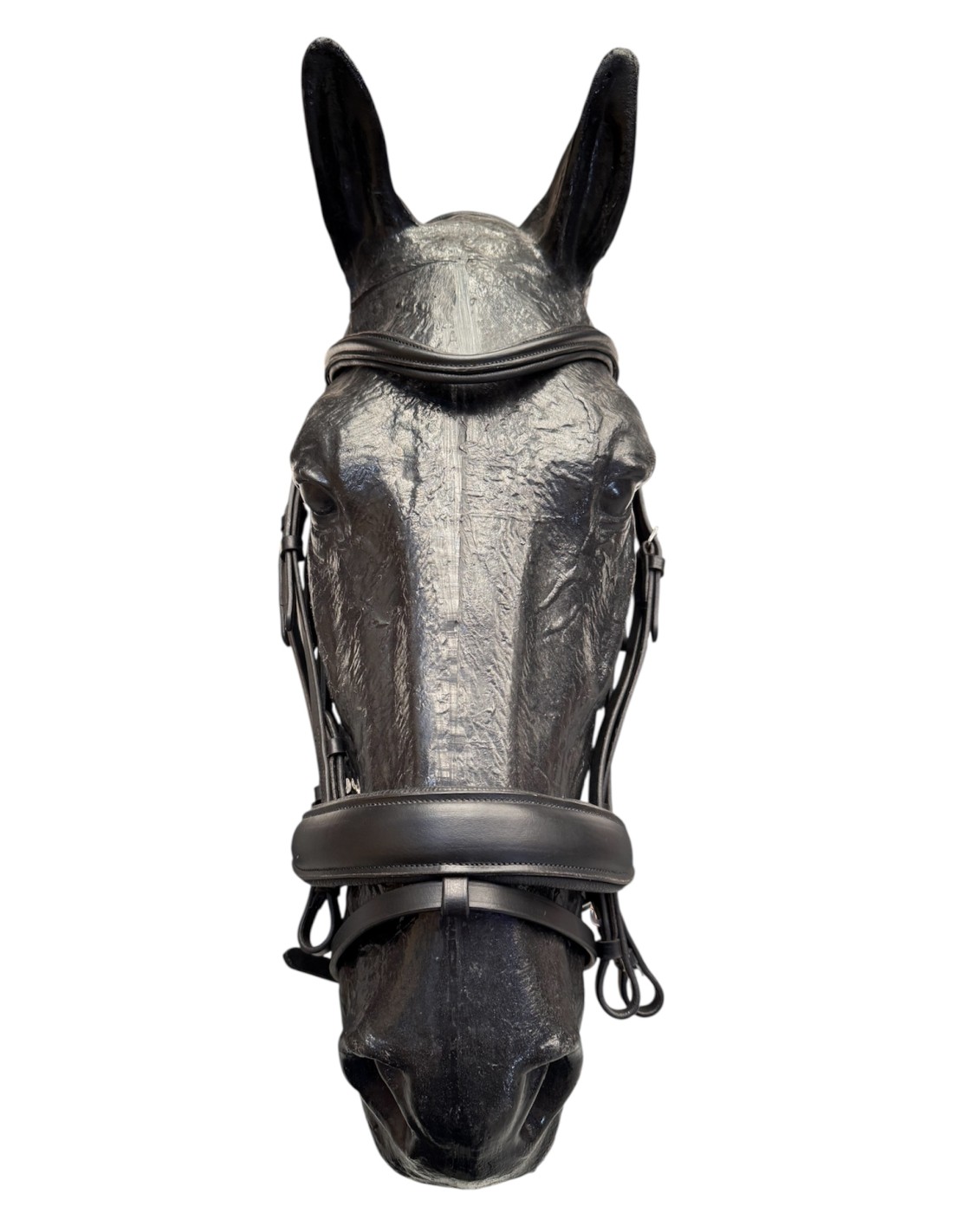 Se trata de una cabezada de la modalidad de doma. Es una cabezada de cuero con doble montante, para montarle filete y bocado, todo el hebillaje es de acero inoxidable.