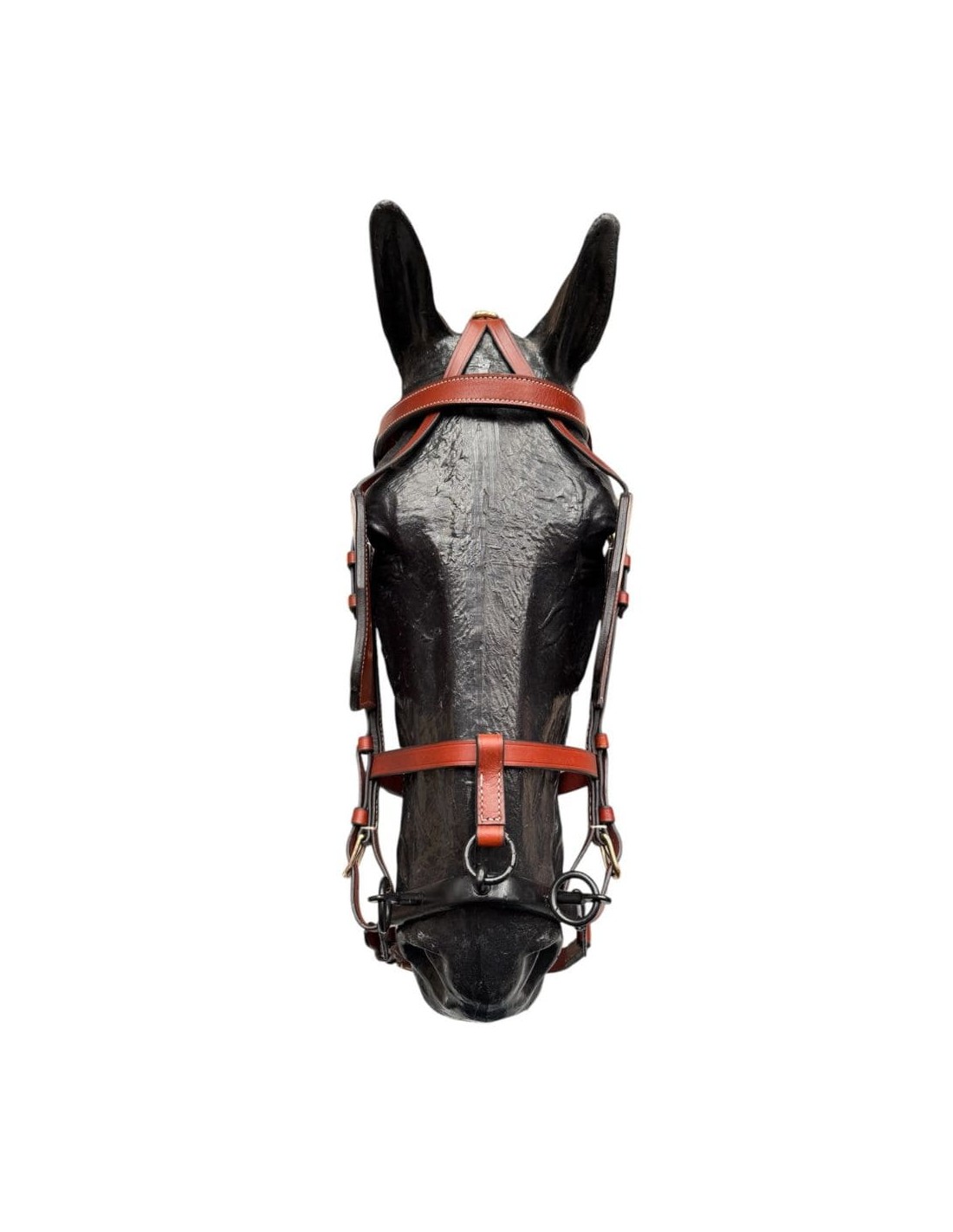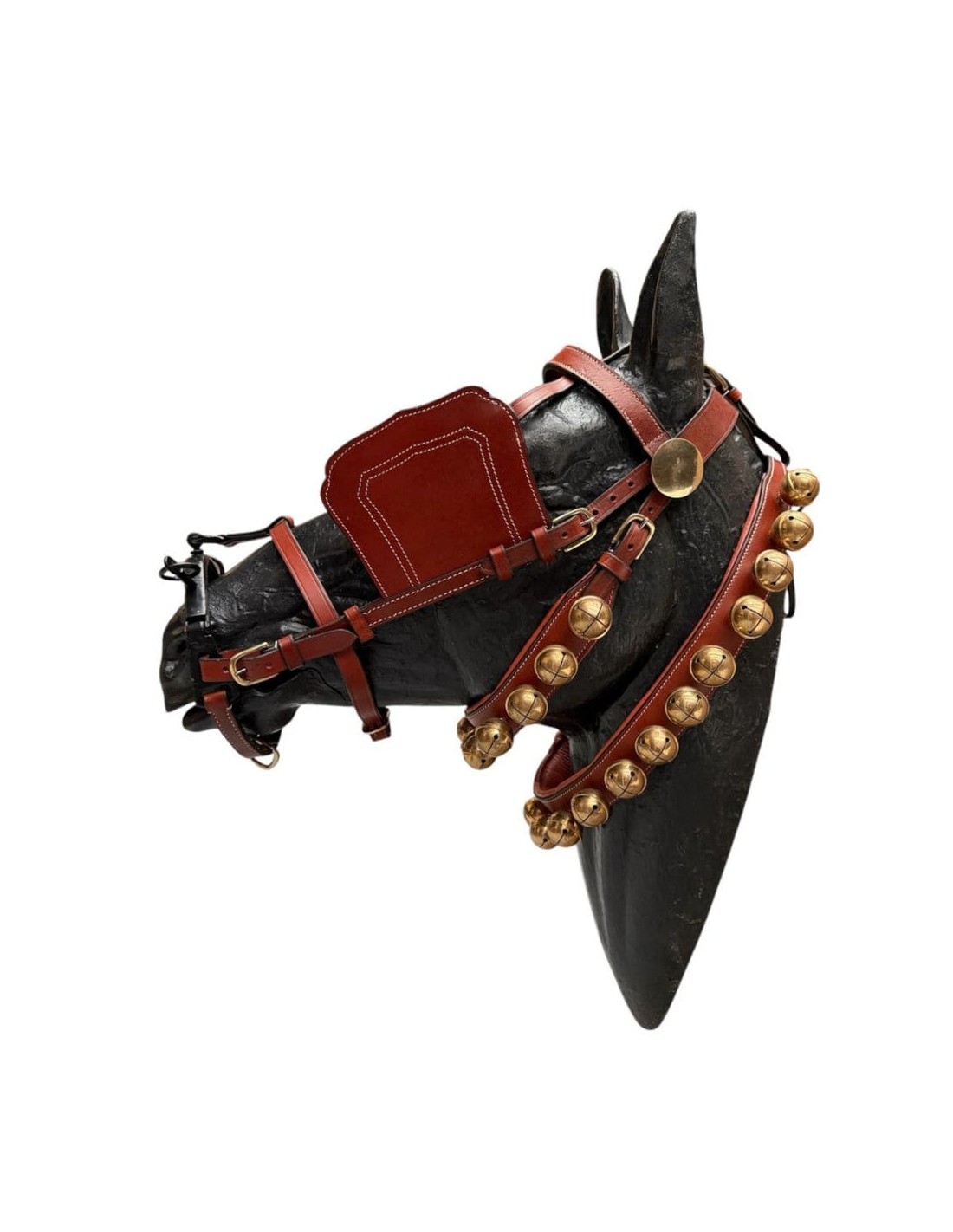 El quita y pon enganche calesero esta fabricado en cuero, su hebillaje es de latón dorado al igual que sus cascabeles. Cuenta con collar y ahogadero de cascabeles y con una serreta de 3 pilares de hierro pavonado. Lo trabajamos en color avellana y en las tallas Full y Cob.