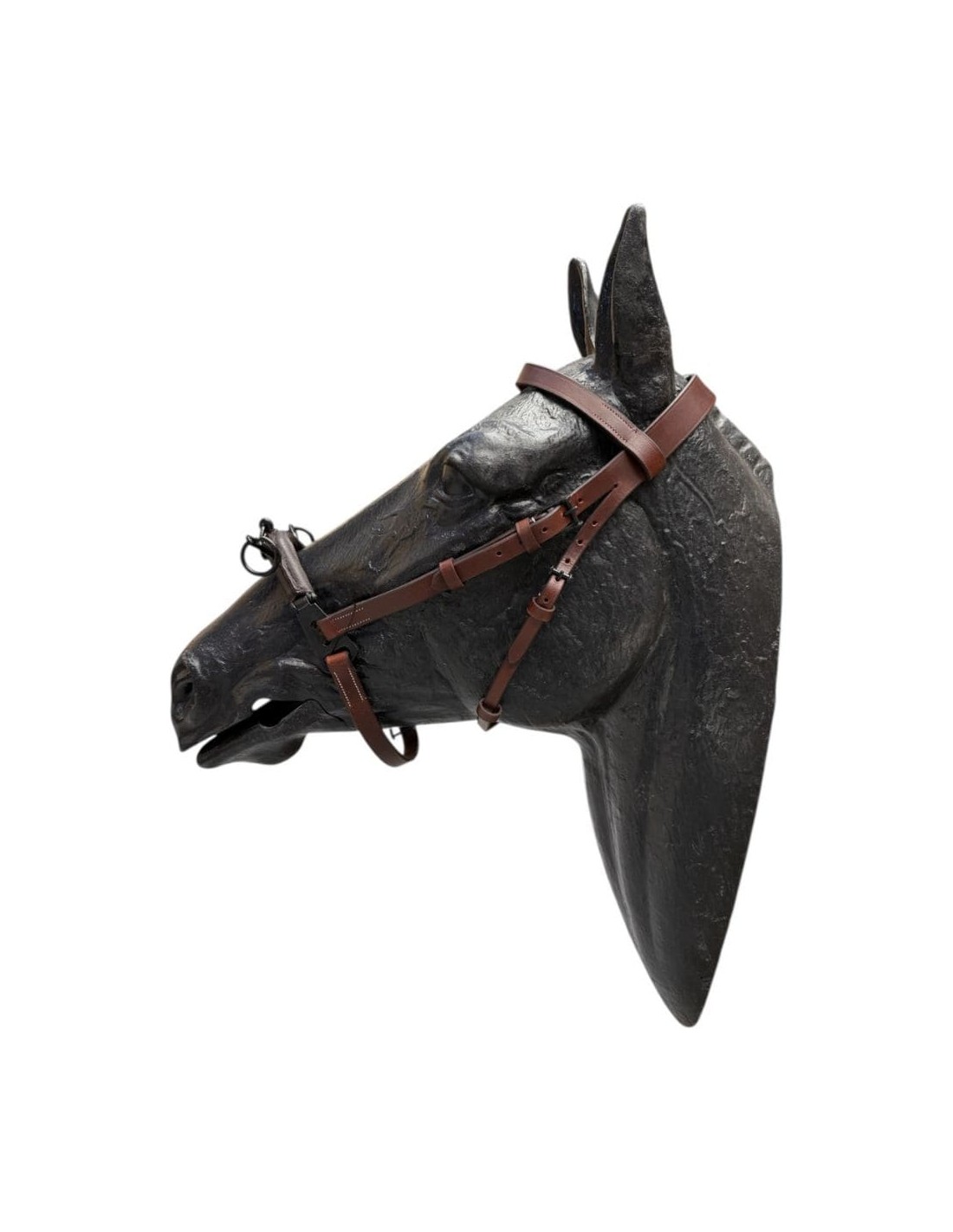 El herraje, realizado en hierro pavonado y forrado en cuero, cuenta con tres pilares: uno central giratorio y dos laterales fijos, lo que garantiza resistencia, durabilidad y un ajuste seguro durante el entrenamiento.