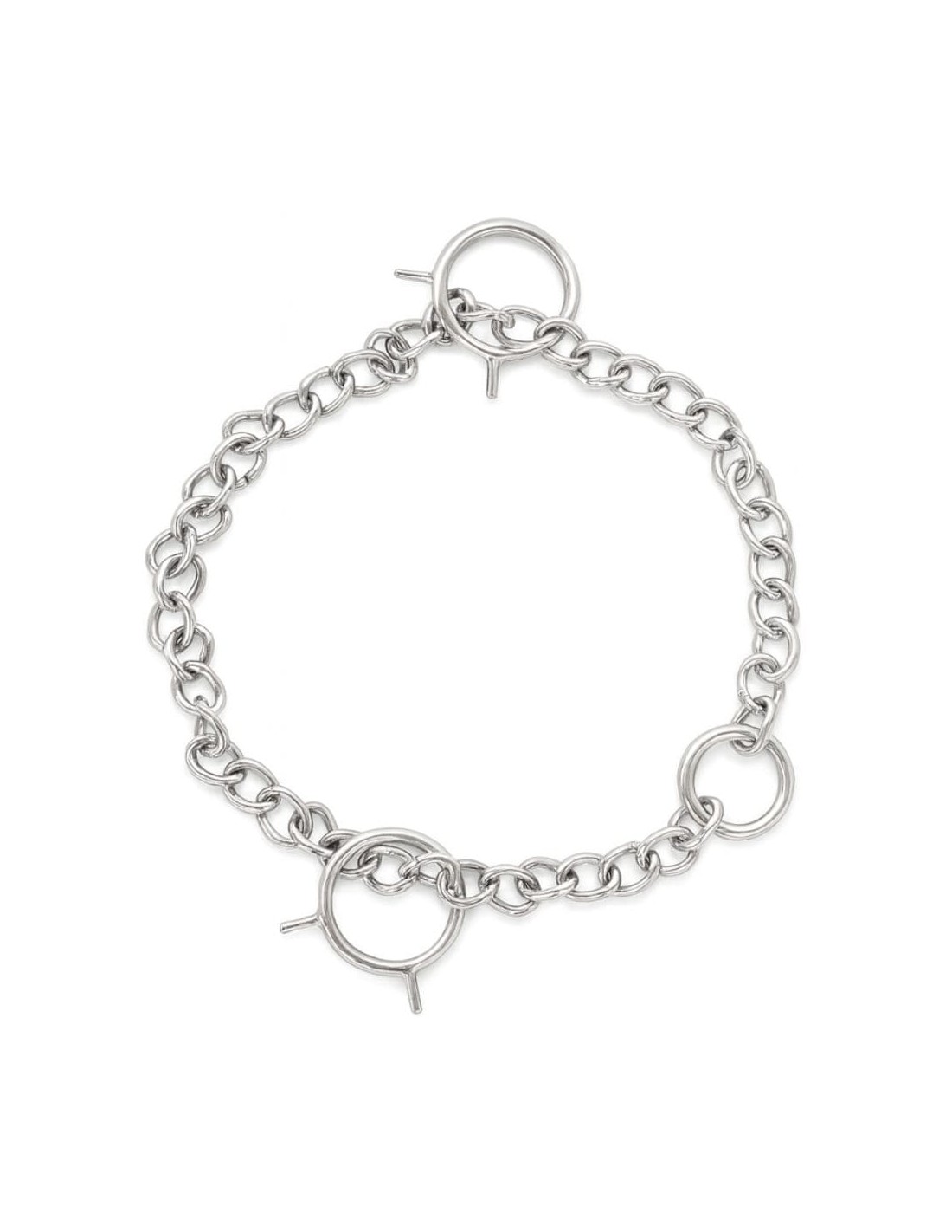 Juego de cadena para cabezada de presentación. Se trata de una cadena con eslabones soldados enlazados entre sí. Dos anillas de 35 mm de paso que tienen dos clavillos cada una que se usan para dejarlos dentro de las costuras de la muserola y el montante evitando así que se giren, y una anilla mas donde se engancha el mosquetón del ramal para su manejo