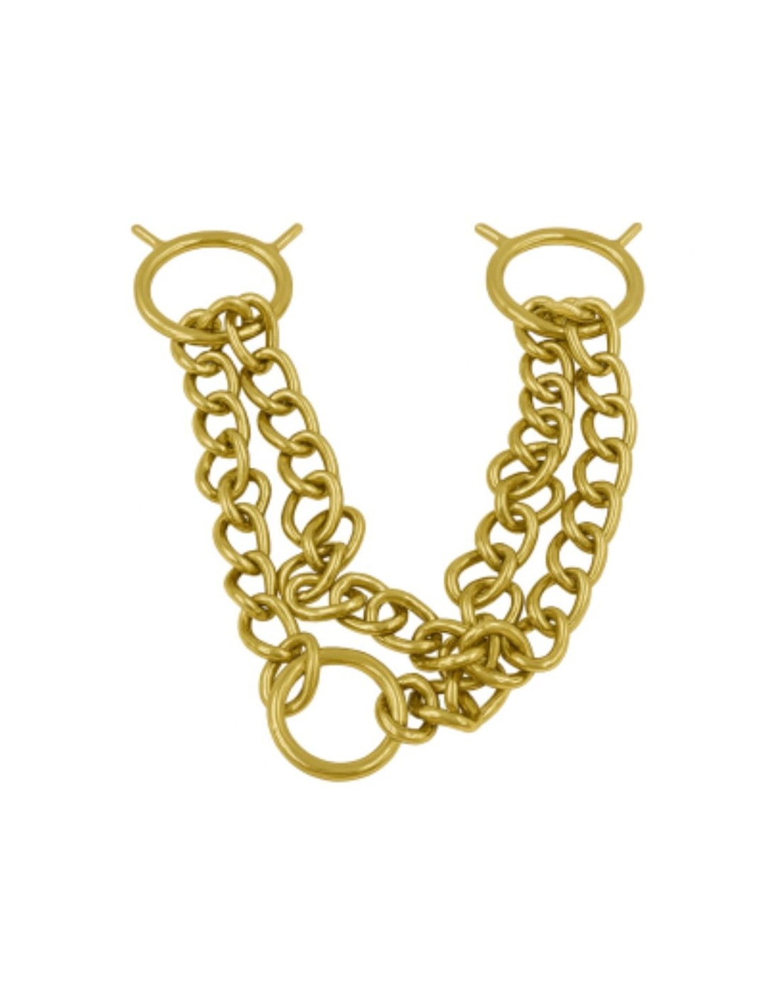 Juego de cadena para cabezada de presentación. Se trata de una cadena con eslabones soldados enlazados entre sí. Dos anillas de 35 mm de paso que tienen dos clavillos cada una que se usan para dejarlos dentro de las costuras de la muserola y el montante evitando así que se giren, y una anilla mas donde se engancha el mosquetón del ramal para su manejo
