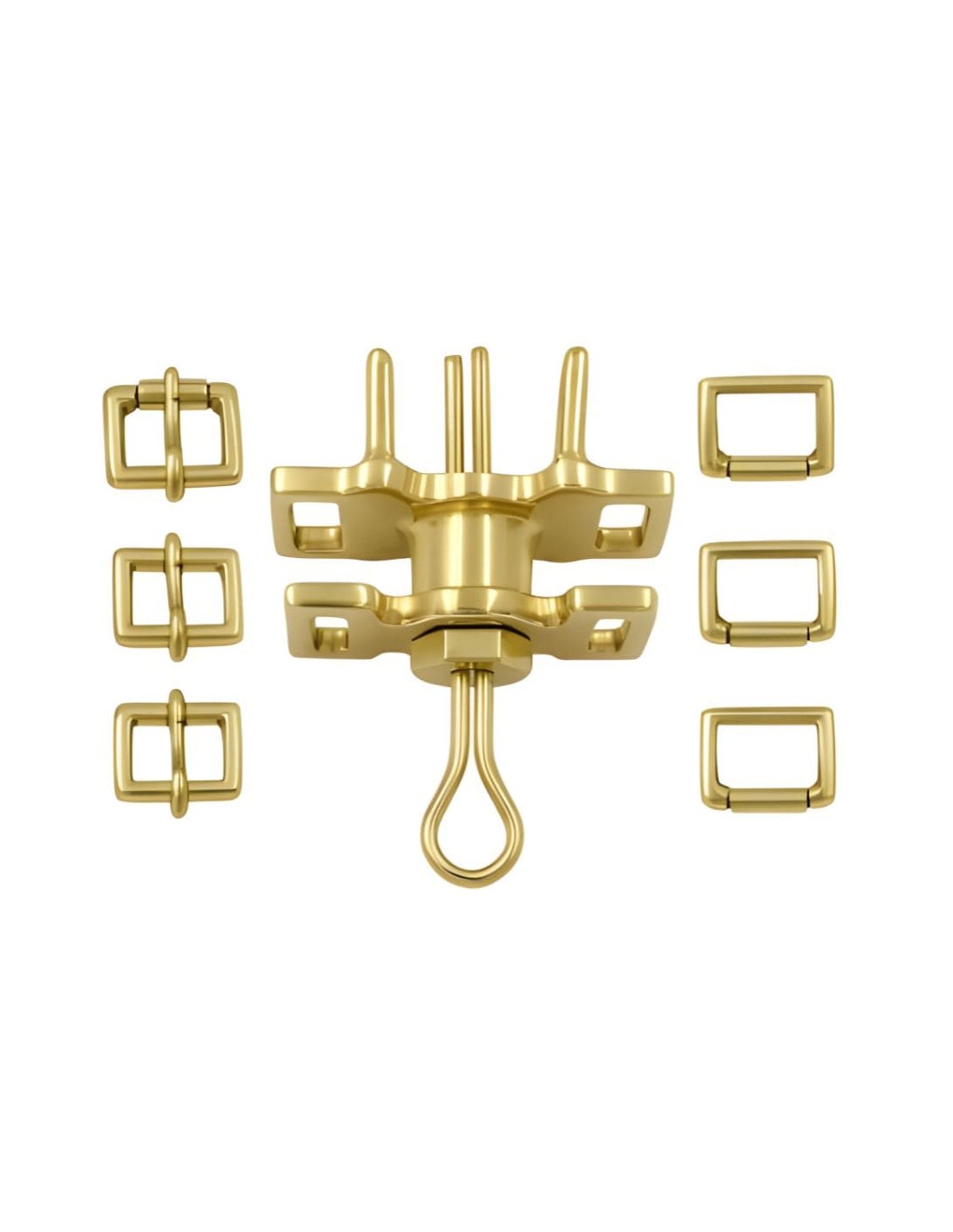Mecanismo de traílla doble para collares de galgos. Fabricado en latón dorado fundido, se compone de un juego completo para una traílla de dos galgos. Incluye mecanismo, tres hebillas de coscojo de 20 mm y tres cuadradillos de 20 mm