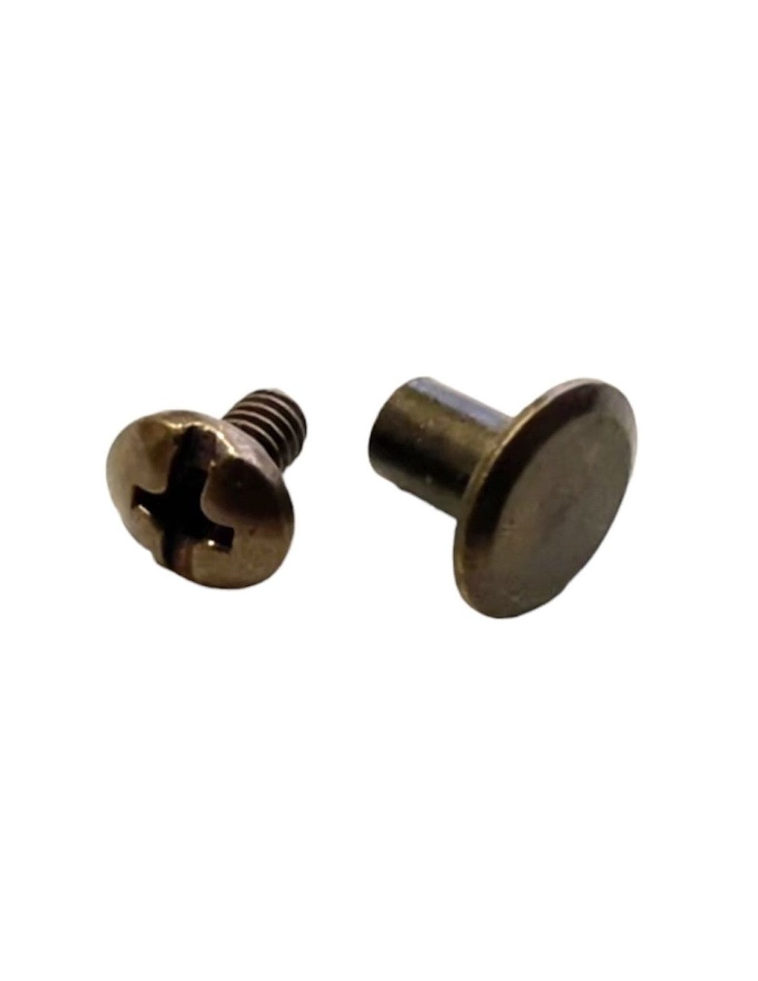 Muy empleado en trabajos de marroquinería debido a su fácil uso. Es un remache que simplemente con roscarlo ya se queda fijado en los dos extremos. Se trata de un remache de latón dorado con un pincho de 5 mm de alto y una cabeza de 9 mm de diámetro.