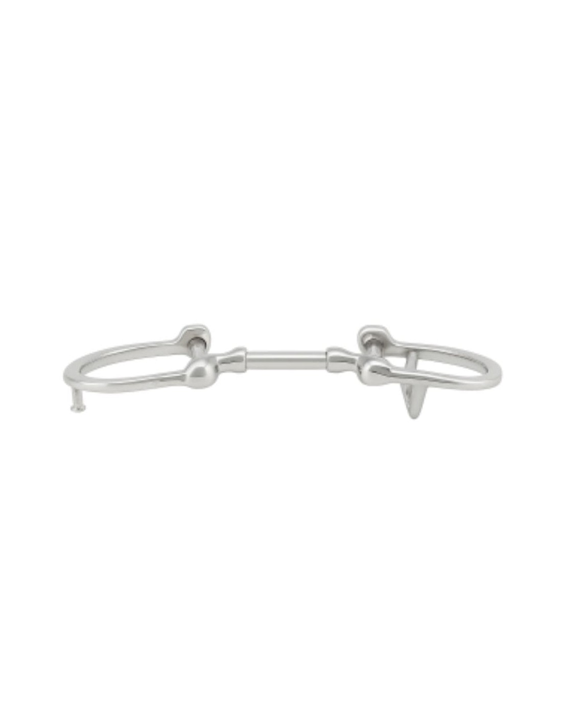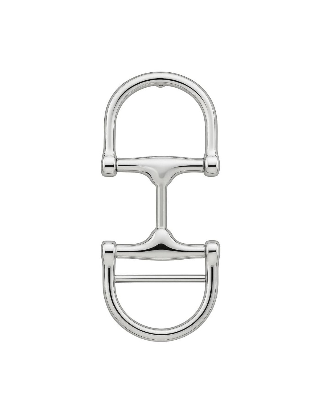 Hebilla de cinturón realizada en latón fundido, con un paso para cinturones de 35 mm y 38 mm. Esta hebilla realizada con forma de bocado tiene en el extremo un pincho que pasa en forma de pasador para regular los puntos del cinturón.
