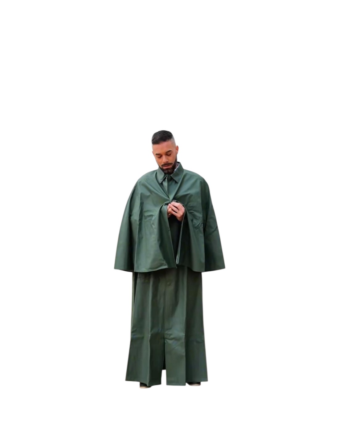 Se trata de un capote impermeable para caballistas. Es una prenda para protegerlos del agua en sus paseos por el campo, ferias o romerías. Fabricado en PVC termo-sellado, el capote se abre por la parte delantera al completo. Incluye una esclavina y una capucha.